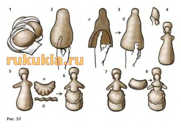 Из куска глины величиной с хорошее куриное яйцо скатайте в ладонях шарик (рис. 37.1). Вдавите в него указательный палец на глубину примерно двух фаланг. Пережмите левой рукой шарик в середине, разделив его на две части (37.2). Причем нижняя часть должна быть больше, чем верхняя. Получится фигура, напоминающая неваляшку. Из верхней части лепят туловище, голову и руки, из нижней — юбку в виде колокола (37.3). Глубина юбки-колокола должна соответствовать длине указательного пальца. Чтобы получить форму колокола, глину постепенно обминайте вокруг указательного пальца. По мере такой обработки стенки колокола будут становиться все тоньше и тоньше, его объем будет увеличиваться (37.3а). Затем стенки колокола промните между указательным пальцем, находящимся внутри, и большим, расположенным снаружи (37.36). Когда толщина стенок будет равна примерно 5—6 см, переходите к лепке туловища, головы и рук. Ком глины, расположенный сверху, разделите на две части так, чтобы верхняя оказалась несколько меньше нижней. Из нижней лепят туловище и руки, а из верхней — голову.
