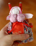 Рожаница. Обережная узелковая кукла. Делалась как оберег для беременнойженщины (или желающей забеременеть), отсюда - красный обережный цветповерх всего живота, грудь делали как можно больше, как у будущейкормящей матери. К пояску привязывали живую семечку, как символзачатия, еще по желанию привязывали монетку в мешочке, чтобы в домеденьги водились и кошачью шерсть на семейное благополучие в доме.Кошачья шерсть символизировала мягкие отношения между домашними в доме. Кукла от Lesena.